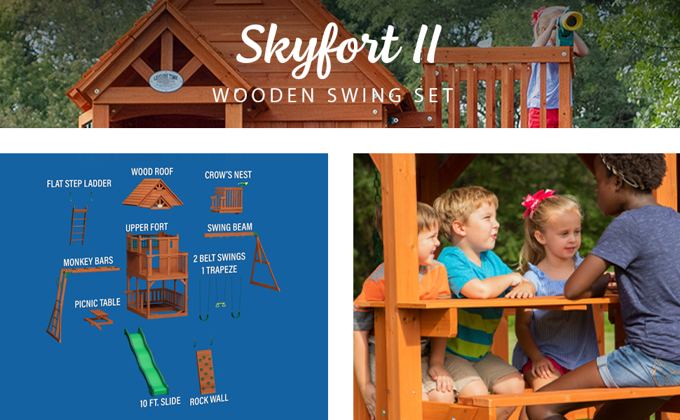 CUSTOMER FAVORITE OUTDOOR SWINGSET: Your kids will have fun playing backyard games on the Skyfort swing set. Nicely equipped with multiple playhouse accessories and features to keep your children entertained for hours.