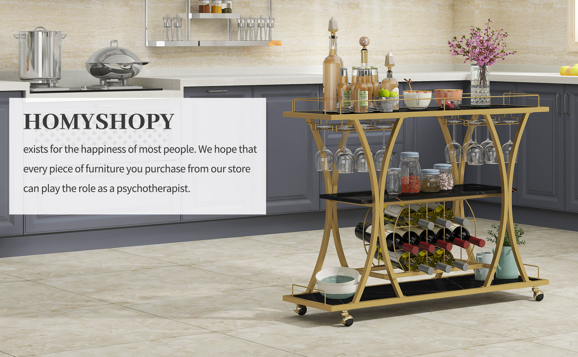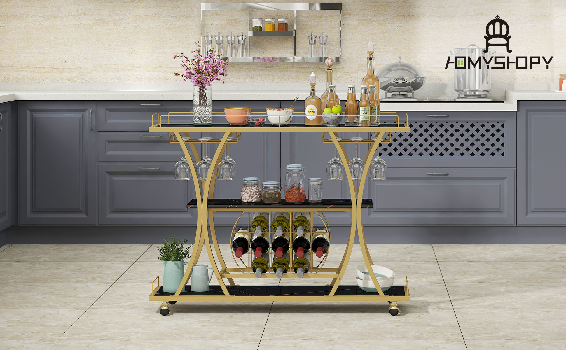• [Solid Construction]-The bar cart composed of MDF board with marble veneer and gold-finished metal frame, which is durable and sturdy. The protect guardrail can prevent sliding efficiently when moving.