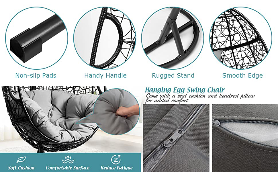• Quick Maintenance & Assembly: The cushion seat and pillow features a zipper to conveniently remove the inner cushion for easier cleaning. Quickly assemble the whole chair with detailed instruction and sufficient accessories. Relax yourself soon in this hanging hammock chair.
