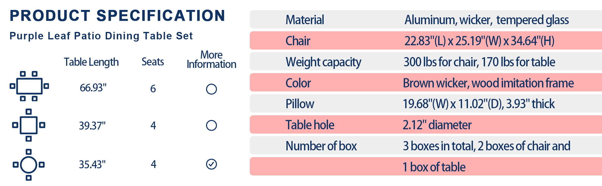 • Premium Wicker: This Patio dining set is crafted with all-weather wicker to withstand different weather condition. Two weaving designs add more elegance to your outdoor living space.