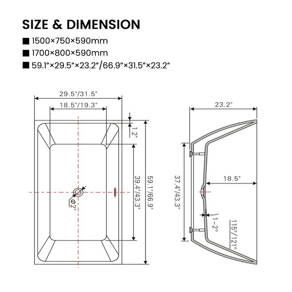 • Flexible drain hose and slotted overflow included, tub filler excluded. Outer dimension (23.4" height x 29.5" wide x 59.1" length); – UPC Certified. We are committed to giving customers excellent after-sales service and products