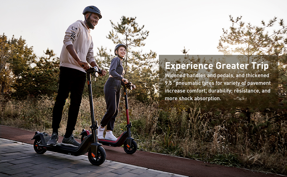 【Bigger & more comfortable】For providing a more comfortable and stable riding experience, the NIU electric scooter is taller, wider and longer than ordinary electric scooters with 25% wider handlebars (47.3’’H × 21.3’’W), a 13% wider deck (6.7W’’ × 23.6’’L), and 30% fatter tires (2.5’’) than other adult e scooters. KQi3 electric scooter for adults can easily accommodate a load of 220 lbs on 9.5’’ rubber tubeless tires with excellent shock absorption.