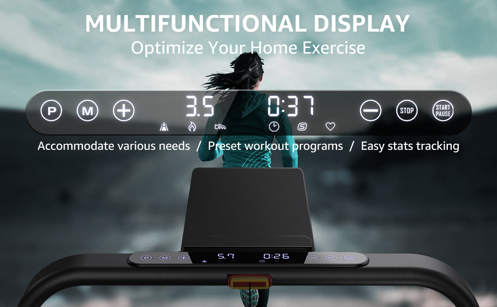 - 17.7”x 48” Tread Belt & Multifunctional LED Display--8 layers non-slip and shock absorption running belt with 8 pieces of deck cushioning, absorbs shock with every step to soften the impact for your joints, muscles, knees and ankles. Larger running space accommodates users of many sizes and long strides. The digital touch screen is easy to use and tracks time, step, speed, distance, etc. 36 Preset Programs elevate your workouts.