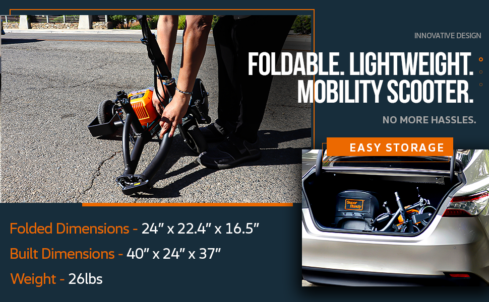 The SuperHandy "Passport" delivers an unparalleled experience in mobility, portability, and comfort. Our replaceable battery powered system is airline friendly, making air travel hassle free. The lightweight and compact design provides true portability and convenience, with the heaviest piece weighing only 26lbs when broken down for storage (Total Weight 35lbs). The "Passport" is one the lightest mobility scooters on the market.