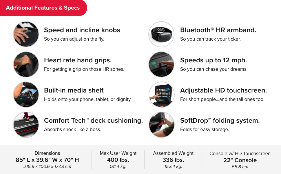 • 22" x 60" running path with Comfort Tech deck cushioning and speed up to 12 MPH